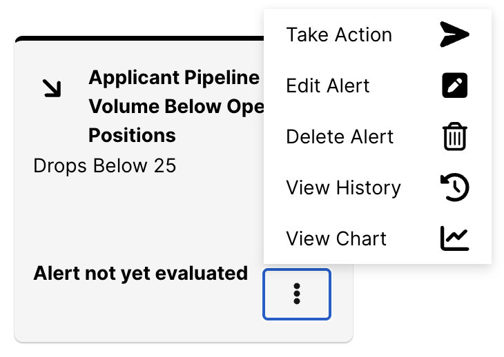Clicking the three dots in the bottom right corner of an alert opens a menu with several options: Take Action, Edit Alert, Delete Alert, View History, and View Chart.