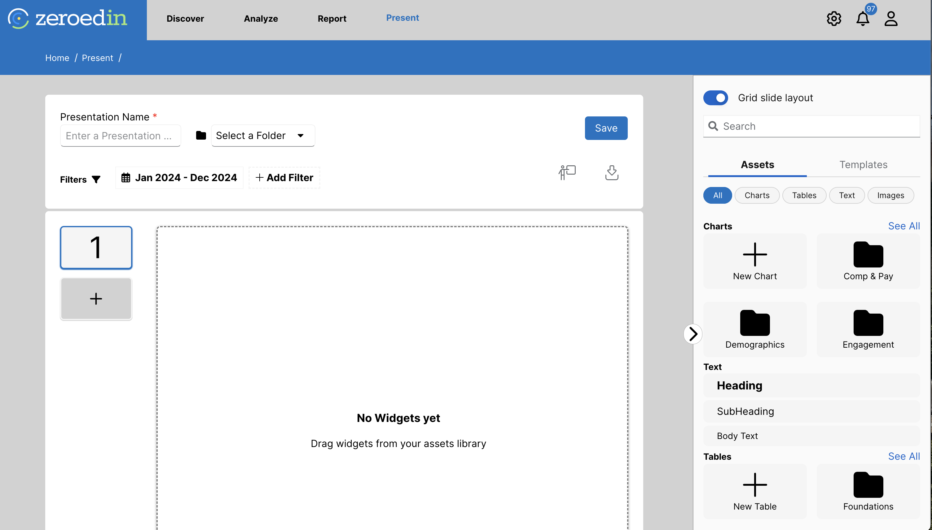 Similar to the dashboards, you can select and drag charts, tables, text files, and images from the right side navigation menu onto the presentation grid. To add them, simply click and drag the widget onto the grid